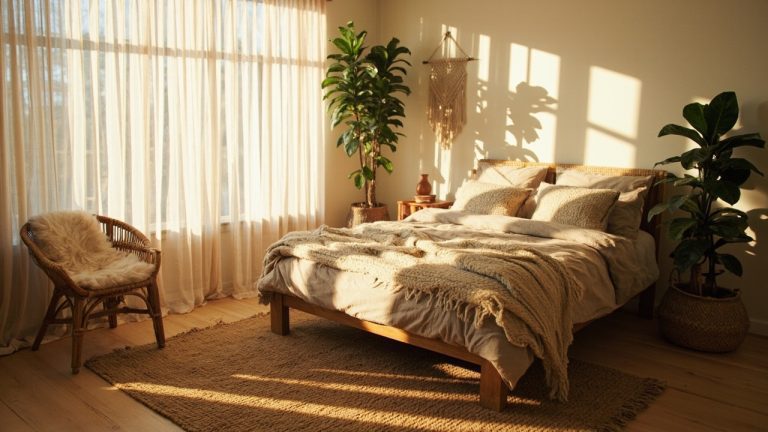 The trick: keep textiles layered but limited—one statement throw, two pillows max, and a single patterned rug—so you retain boho warmth without the chaos. Prioritize natural materials (oak or rattan furniture, stone or ceramic accessories) and set a budget limit per category (for example: bed frame mid-tier, textiles low–mid) to prevent mission creep during sourcing.