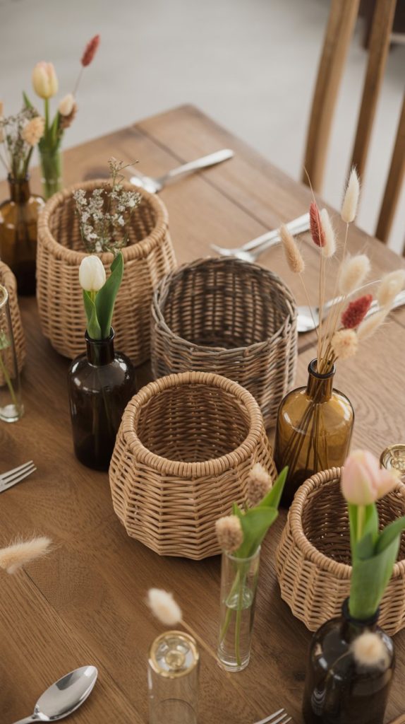 Choose woven seagrass baskets and smoked glass vases; the tactile contrast keeps a boho table feeling authentic and layered. Line shallow baskets with a waterproof liner, cluster small glass test tubes inside for water, then place mixed fresh and dried stems, keeping proportions low, about 8–12 inches tall, so sightlines across the table stay open.
