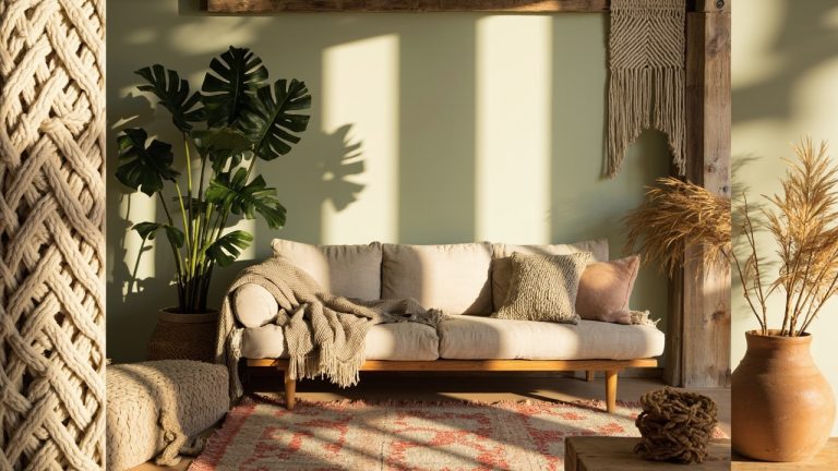 - Living room: place a low-profile sofa against a neutral wall; anchor with a natural-fiber rug and one oversized macramé or woven wall hanging. Add two smaller patterned cushions rather than many small ones to keep the look intentional.