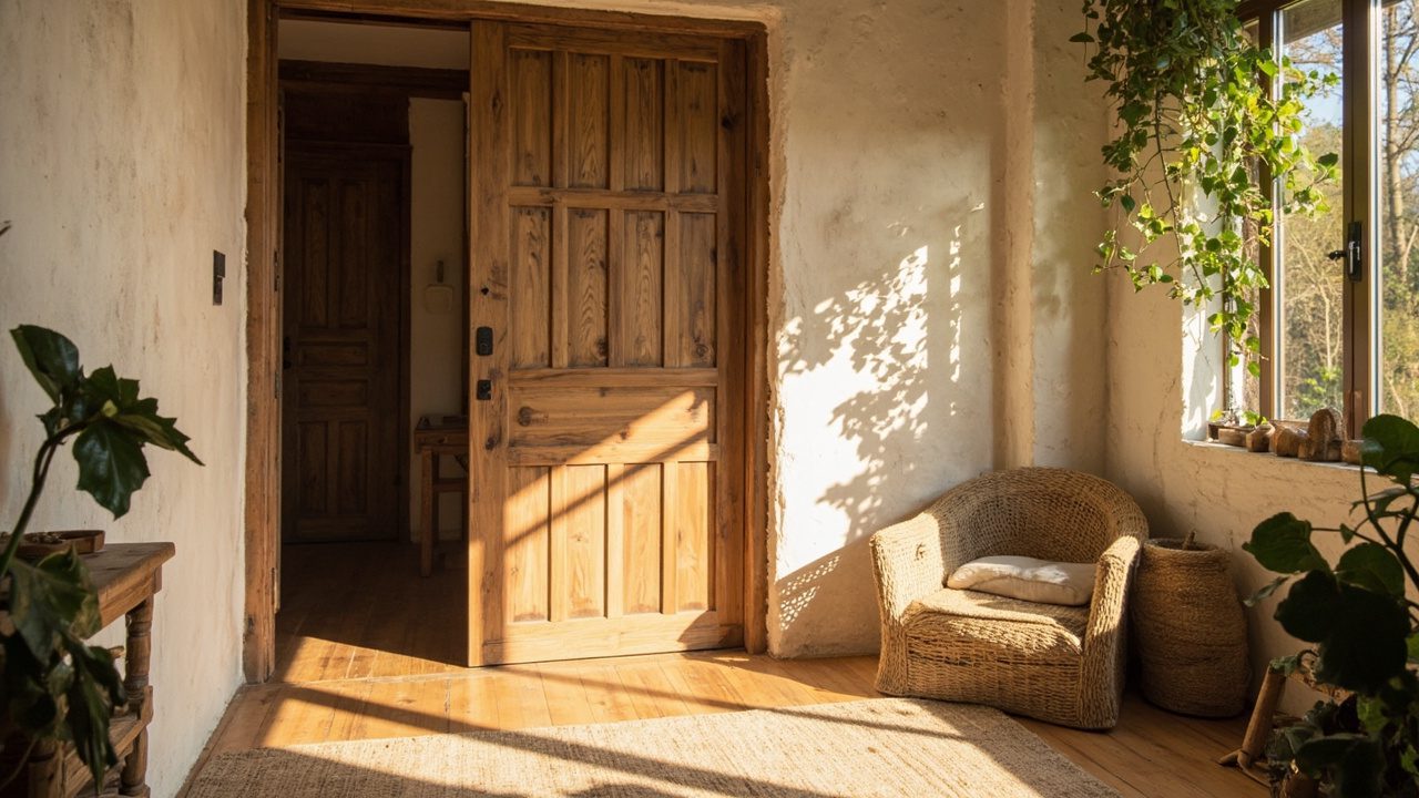 Rattan frames bring warm, organic structure and suit doors with darker stains or modern black hardware, providing a pleasing contrast.