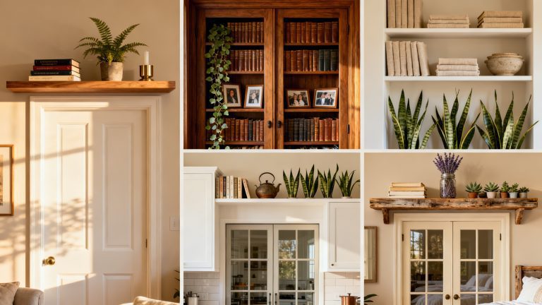 Span a 1×8 hardwood board across the door casing with L-brackets anchored into studs, then paint it the same color as your trim for a tailored look. Keep books under 9 inches tall and add brass bookends to prevent slides when the door shuts.