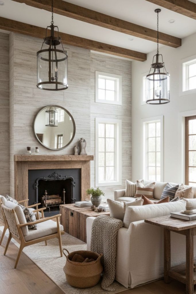 Introduce one or two raw materials like reclaimed wood beams or iron light fixtures to anchor the rustic character without cluttering the silhouette.