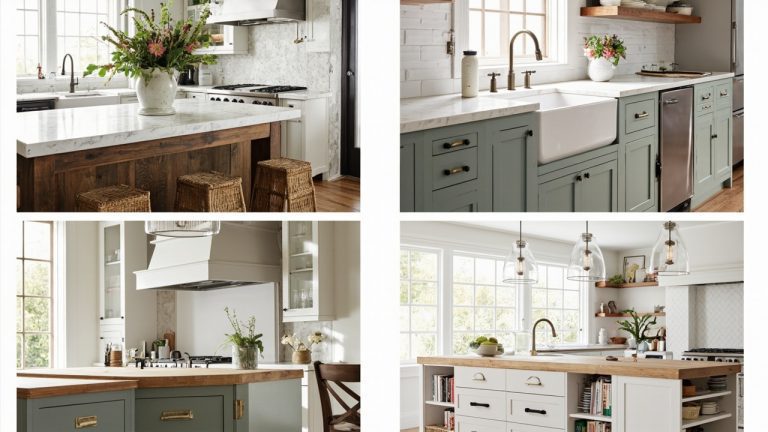 • Contrasting islands are a classic farmhouse move: darker base (deep green, charcoal) against lighter perimeter cabinets creates depth.