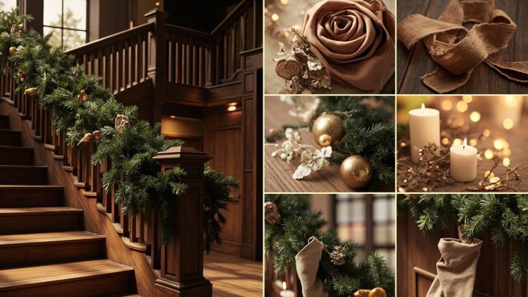 When styling, offset the wood with metallic accents: brushed brass candle sconces on the stair wall or copper ribbon woven through garlands. Be mindful of contrast—if your walls are already deep, choose lighter wood tones like honey oak.