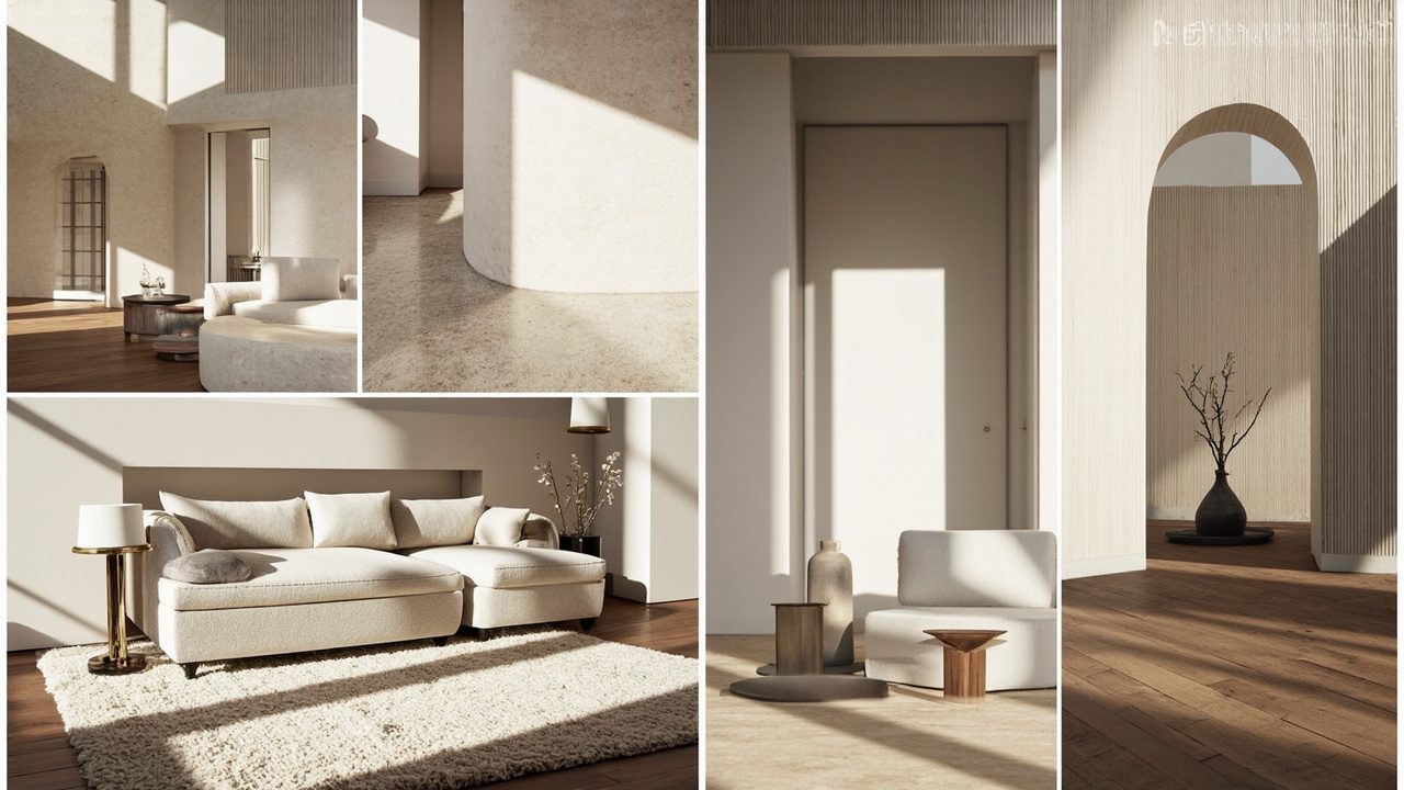 Focus on quiet-luxury materials: artisanal surfaces, matte stone, soft wools, silk-blend cushions, and warm metals like brass. The emphasis is on tactile quality and restrained sheen rather than ornate decoration.