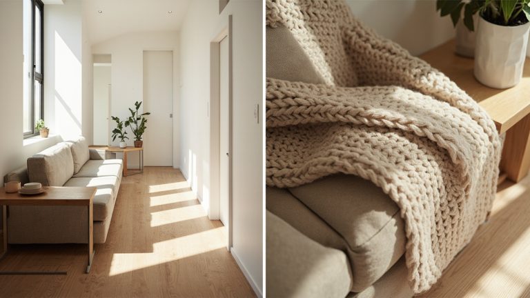 Natural jute brings texture without visual weight, which helps narrow rooms feel more grounded yet airy.