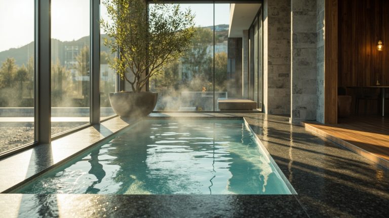 Combining a plunge pool with spa heating turns short swims into year-round ritual, aim for a water temperature range of 82 to 95°F depending on use.